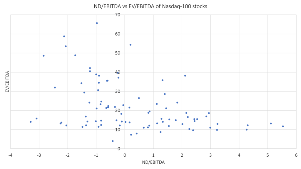 Admittedly, the range of UK tech stocks with leverage is limited, so to highlight the situation for larger stocks from the predominantly tech-exposed Nasdaq-100: