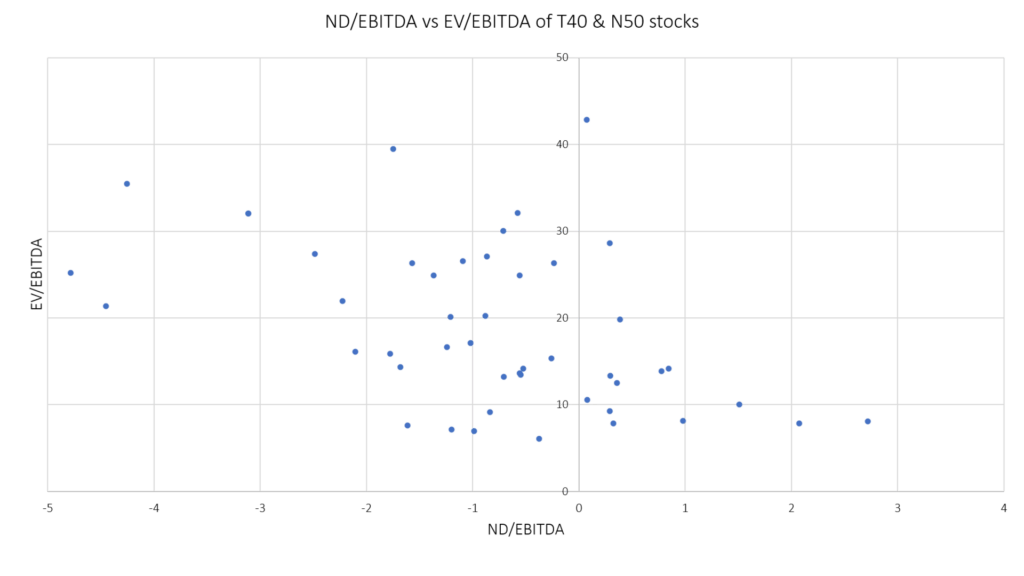 When we freeze the valuation data as of yesterday, the chart below highlights that leveraged tech stocks within the Tech 40 and Next 50, are typically facing a ceiling on their 12-month forward EV/EBITDA. (Net cash/EBITDA is negative on the x-axis below, Net debt/EBITDA is positive, and we only include stocks with 12-month forward forecasts):